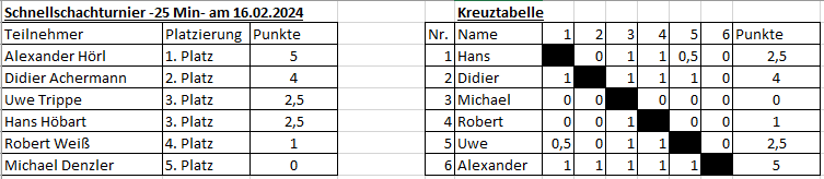 Am 16.02. fand in kleiner Runde ein Schnellschachturnier mit 25 Minuten Bedenkzeit je Spieler statt. Erfreulicherweise nahm auch Uwe Trippe an diesem Turnier teil, der sich zuletzt eine Schachpause gegönnt hatte. In Bestform zeigte sich Alexander Hörl der alle seine Spiele gewann und stolze 5 Punkte erreichte. Ebenfalls stark und einen guten zweiten Platz erreichte Didier Achermann mit 4 Punkten. Uwe Trippe und Hans Höbart erreichten mit je 2,5 Punkten einen geteilten 3. Platz. Robert Weiß und Michael Denzler komplettierten das Teilnehmerfeld.