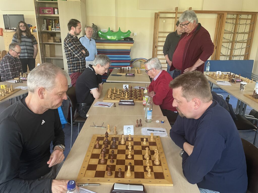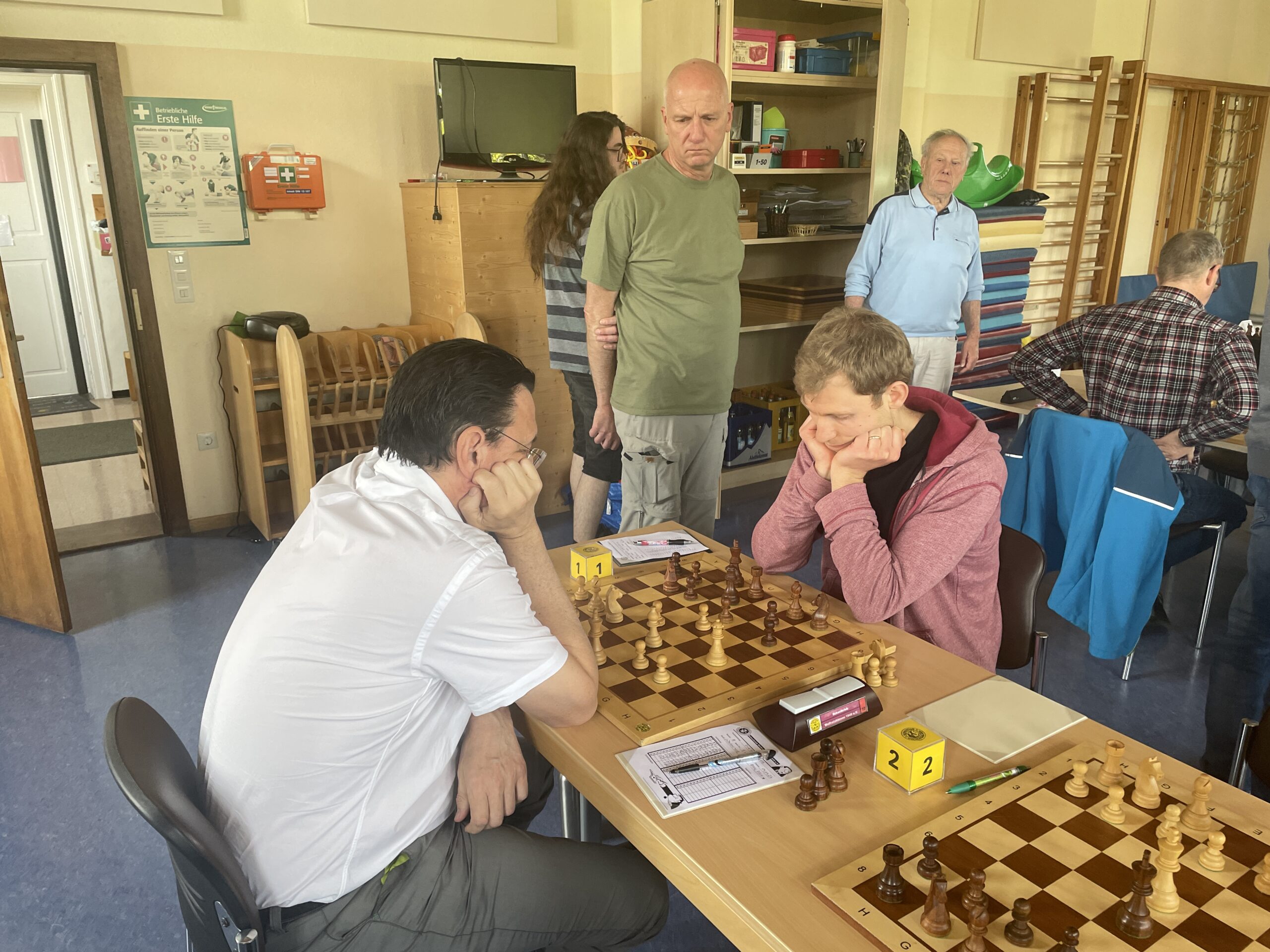 Bericht 1. Mannschaft: Robert Balder und Reinhold Pohle einigten sich relativ schnell mit ihren Gegenübern auf ein Unentschieden, was den Druck auf die verbleibenden vier von uns recht früh erhöhte. Stephan Balder versuchte es an Brett 6 mit „Stonewall im Anzug“, was nicht nur schwerfällig klingt sondern praktisch auch ist. Nach wechselseitigen Manövern ging beiden Spielern die Munition aus, was somit auch hier zum Remisschluss führte. Viel Kopfzerbrechen wurde Felix Beck an Brett 1 (oben rechts) auferlegt. Lange Zeit in einer gedrückten Stellung spielend gelang es ihm aber geschickt die Stellung zu halten. Zwischenzeitlich konnte aber Matthias Schmidt dem ansteigenden Druck an Brett 4 nicht standhalten und die erste verlorene Partie war zu notieren. Renato Wittstadt an Brett 5 hatte als einziger einen Vorteil auf den Brett (zumindest aus Sicht unbefangener Zuschauer), aber irgendetwas muss schief gelaufen sein, denn auch diese Partie ging verloren. Das 2:4 bedeutet nicht nur den Verlust der Tabellenführung sondern vermutlich auch des Titelgewinns. Aber greifen wir dem letzten Spieltag nicht vor…