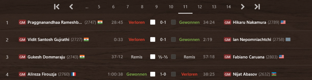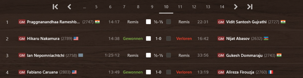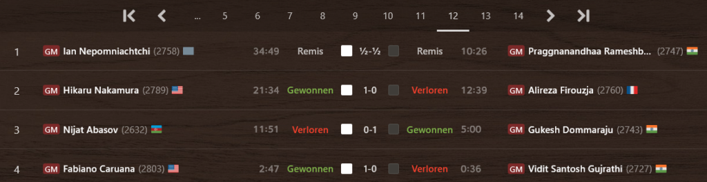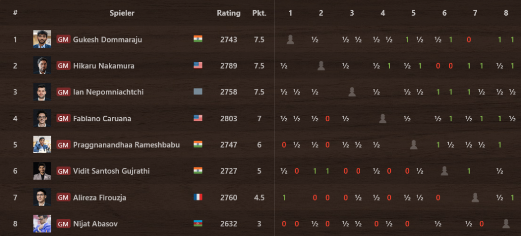 In Toronto, Kanada, nähert sich das Kandidatenturnier 2024 seinem dramatischem Ende: nach zwölf gespielten Runden liegen Gukesh Dommaraju (Indien), Hikaru Nakamura (USA) und Ian Nepomniachtchi (Russland, unter FIDE-Flagge spielend) mit 7,5 Punkten punktgleich vorne. Mit nur einem halben Punkt Abstand dahinter und deshalb durchaus noch mit Chancen steht Fabiano Caruana (USA) auf Platz 4.