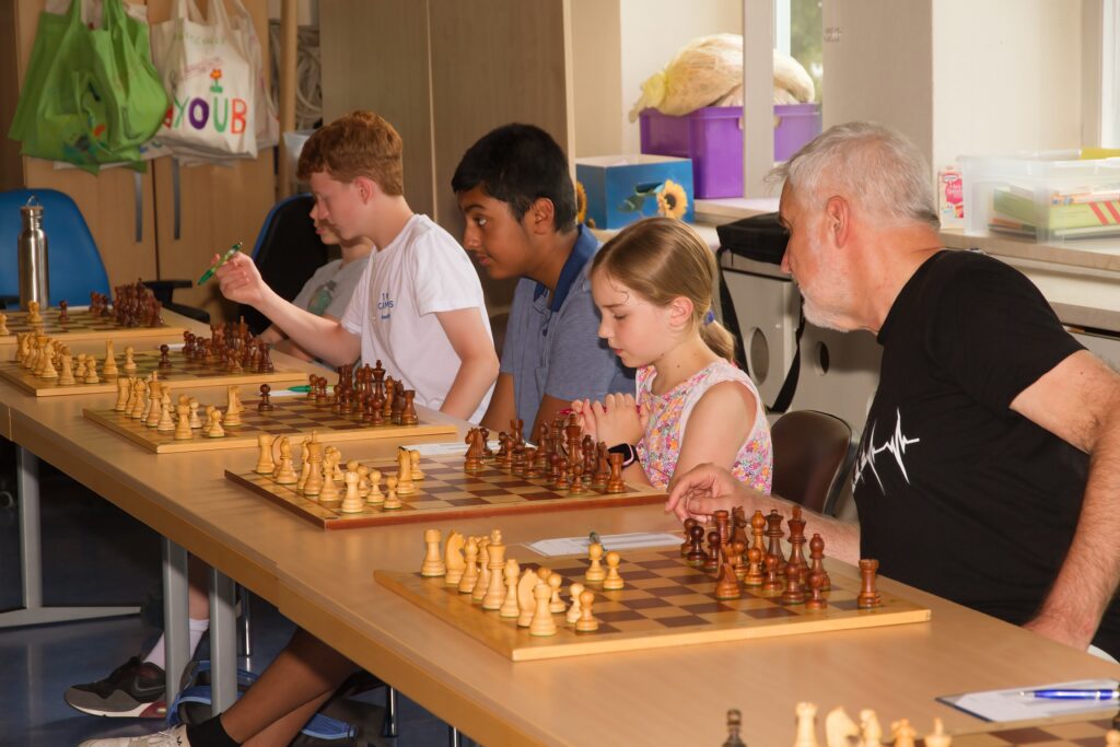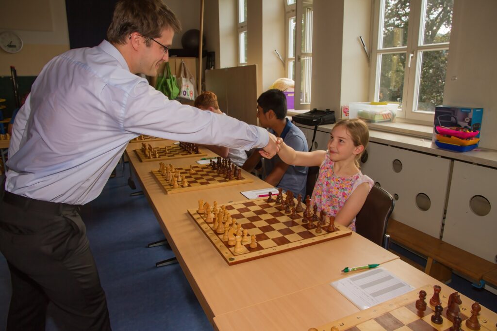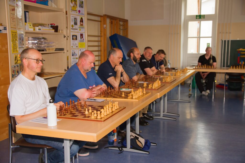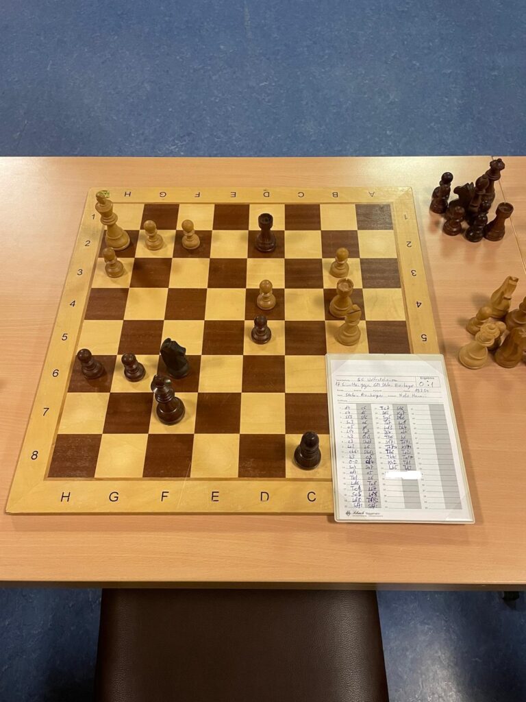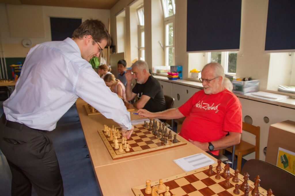 Der aus Wolfratshausen stammende GM Stefan Bromberger spielte am 19. Juli gegen 17 Gegner gleichzeitig, wobei er 16 Partien für sich entscheiden konnte. Niels Hamann gelang es aber mit einer bemerkenswerten Partie, dem Großmeister ein Bein zu stellen: Aus der „Slawischen Verteidigung“ heraus entwickelte sich bis zum 26. Zug eine recht ausgeglichene Stellung. Ein Turmeinschlag auf e6 schien auch diese Partie für Stefan zu entscheiden, aber Niels konterte mit einem kaltblütigen h6, welches ihm eine Figur für nur zwei Bauern einbrachte und die Partie tatsächlich kurze Zeit später für ihn entschied (Schlußstellung sh. letztes Bild). Bravo Niels!