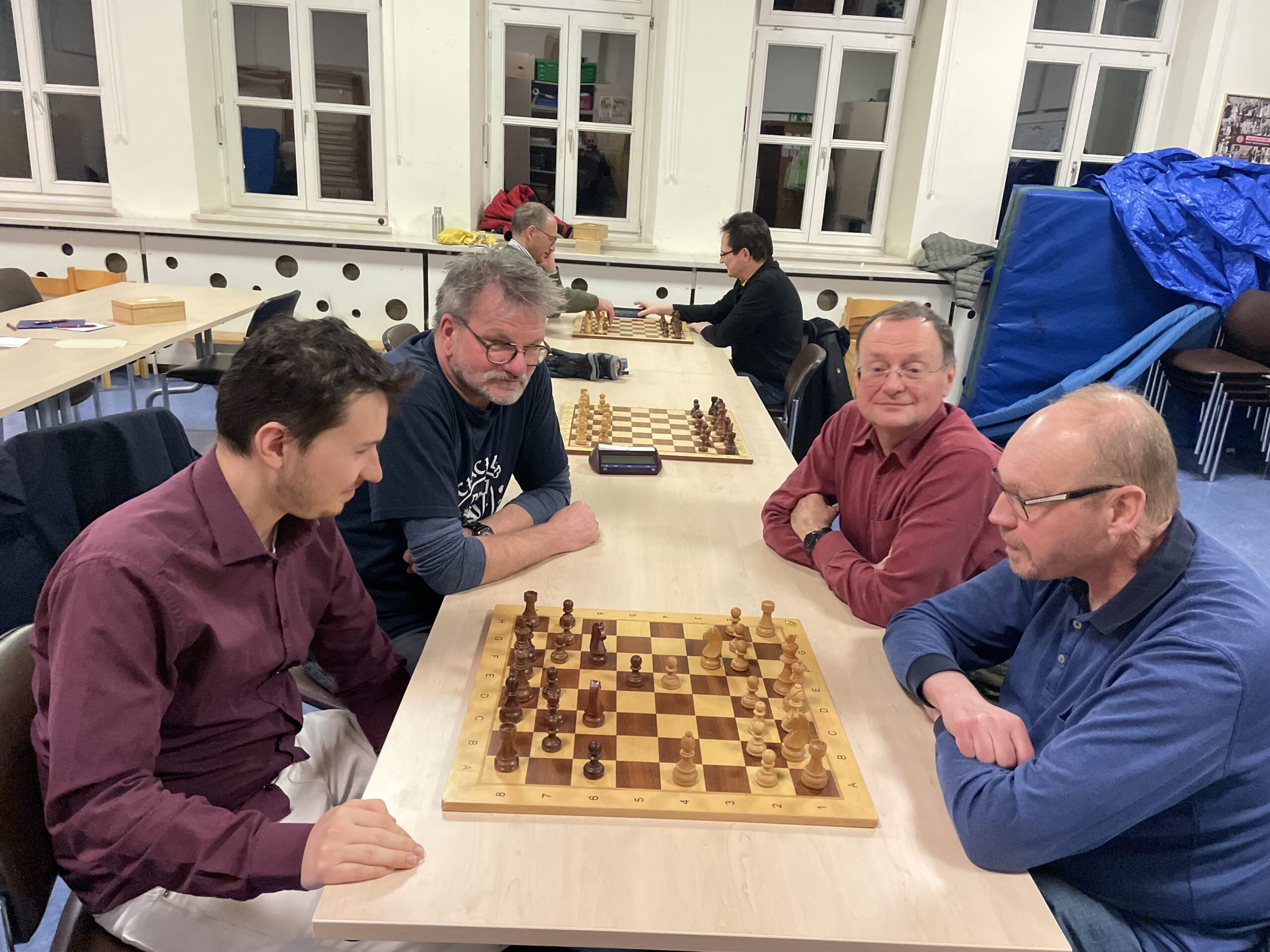 Habt ihr schon einmal von „Hand and Brain“ gehört? Hand and Brain (deutsch: Hand und Hirn) ist eine Schachvariante, bei der zwei Spieler für die Bewegung der Figuren einer Seite verantwortlich sind, die Hand und Hirn genannt werden und verschiedene Rollen haben. Ein Spieler (Brain) nennt je Zug eine zu ziehende Figur, der andere Spieler (Hand) muss (bzw. darf) entscheiden, welcher Zug dann damit ausgeführt wird. Das führt zu spannenden Entwicklungen und manchmal ungeahnten Überraschungen! Hans und Stephan haben es am Freitagabend mit unseren Neuzugängen Matthias (links) und Gerit (rechts) in einer freien Partie ausprobiert. Es hat wirklich Spaß gemacht! Wer es sich mal ansehen möchte: Kommenden Freitag um 19 Uhr spielen Alexander und Stephan mit unseren U16-Nachwuchshoffnungen David und Moritz. Dann mit Uhr (1h) und Notation.