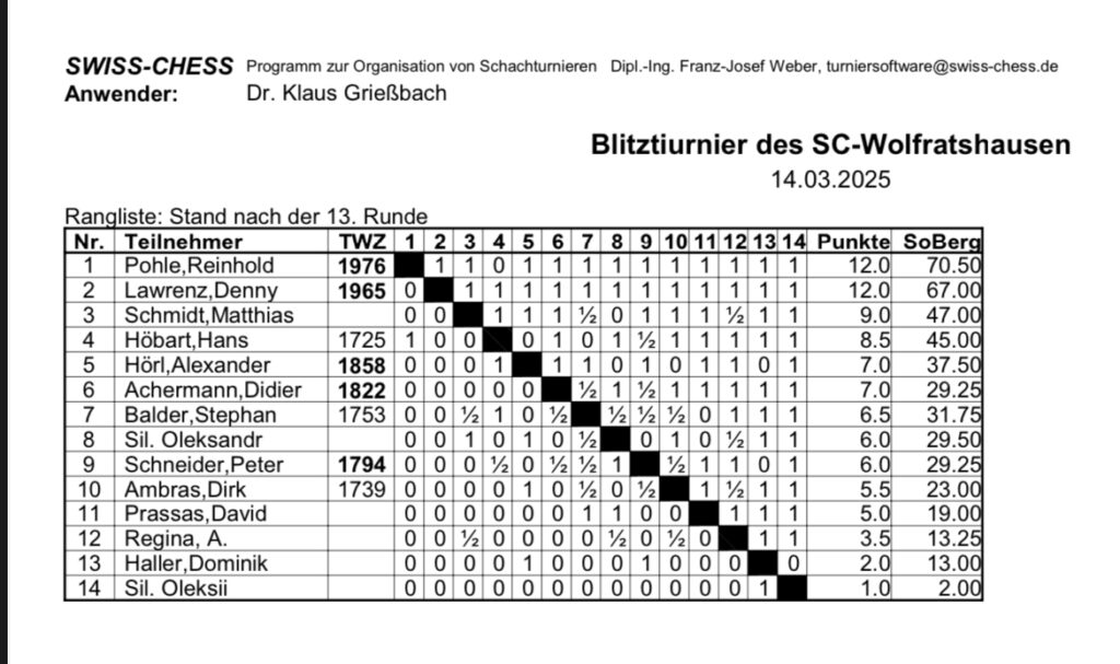 14 Schachfreunde folgten der Einladung von unserem Spielleiter Klaus Grießbach zum ersten Blitzturnier in diesem Jahr. Mit je 12 Punkten aus 13 Runden lagen am Ende Reinhold Pohle und Denny Lawrenz souverän ganz vorne, wobei der gewonnene direkte Vergleich Reinhold den 1. Platz einbrachte! Sehr schön auch, dass einige unserer Neuzugänge und Gäste mitgemacht haben!